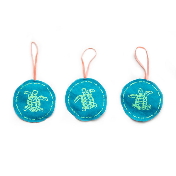 Printed on bright blue vintage cotton, hanging from a peach velvet loop and backed with upcycled taffeta. Approx 5" wide