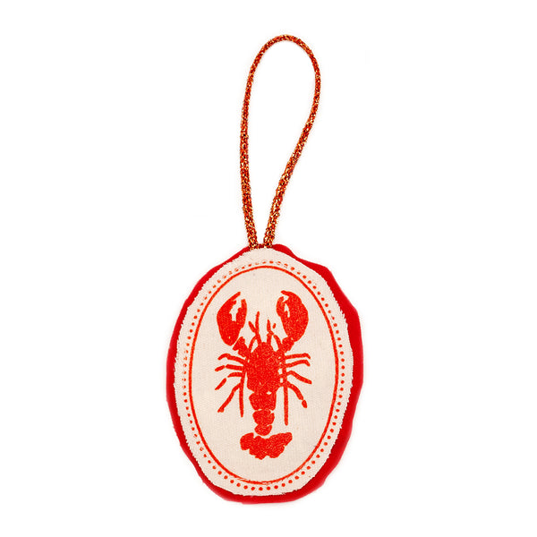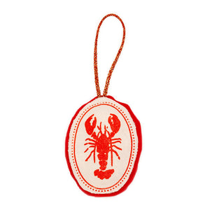 This fun crustacean is printed in a shimmery scarlet ink on a durable cotton canvas, with an upcycled cotton backing, hanging from vintage metallic copper ribbon.