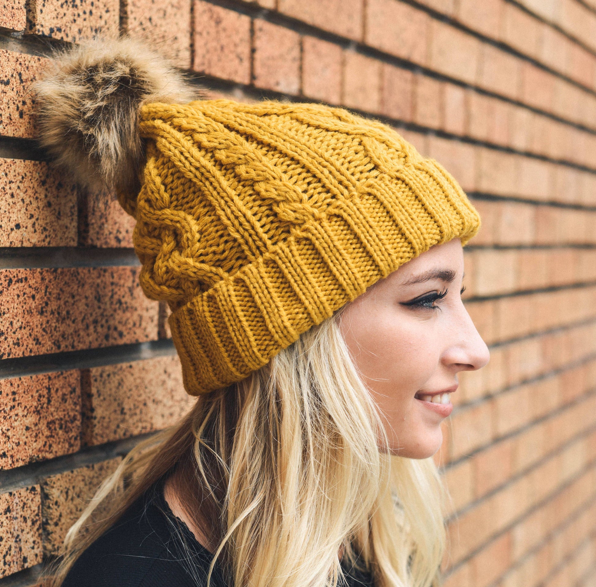 Cable Knit Beanie With Faux Fur Pom in Mustard