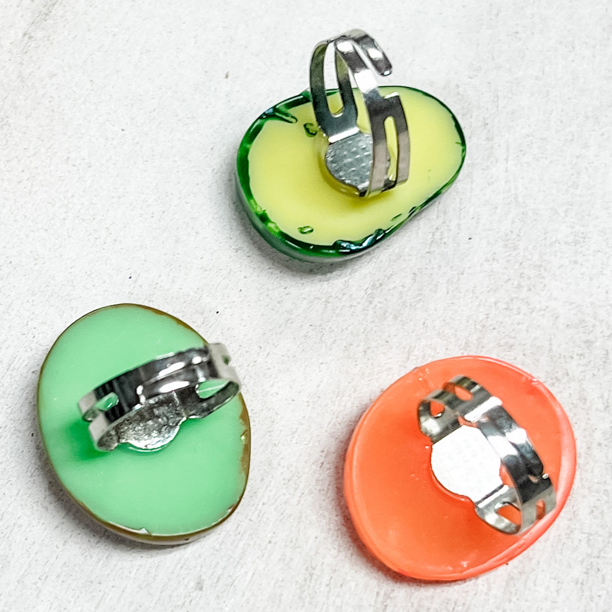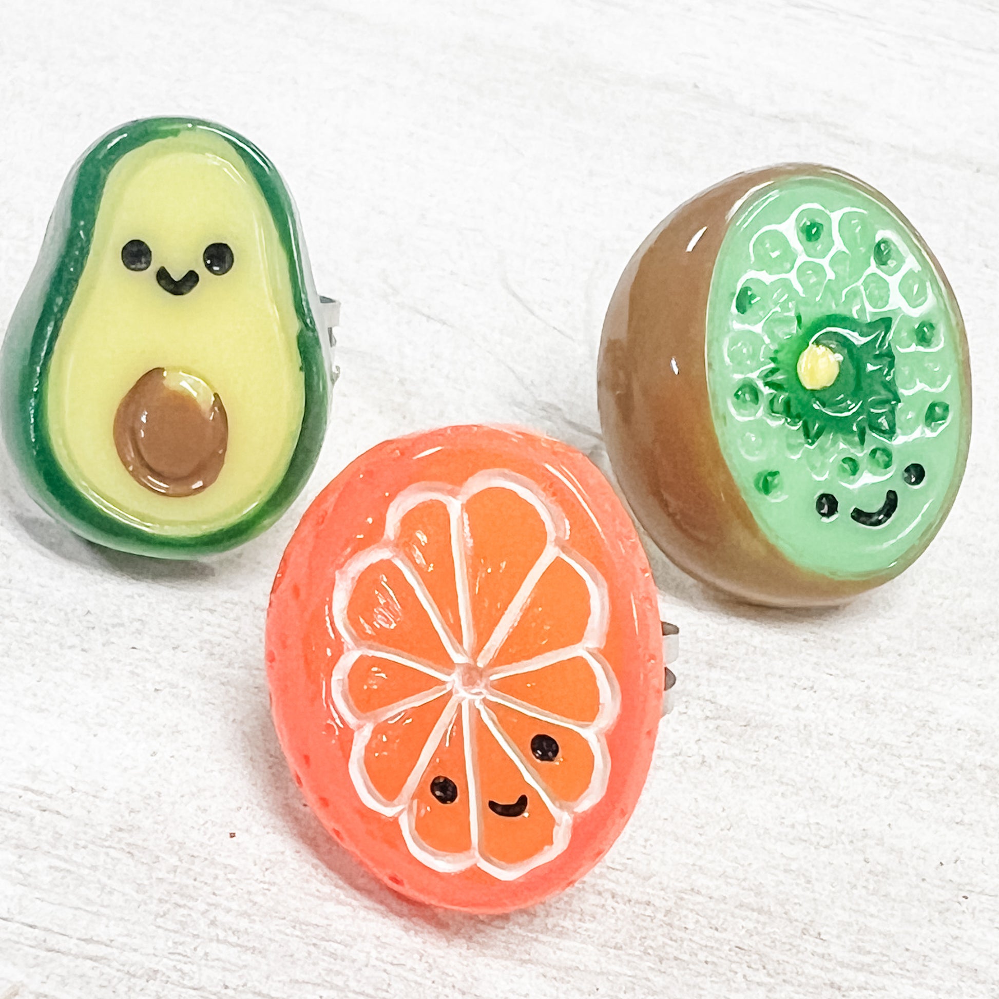 Plastic cabochon fruit on adjustable metal ring.