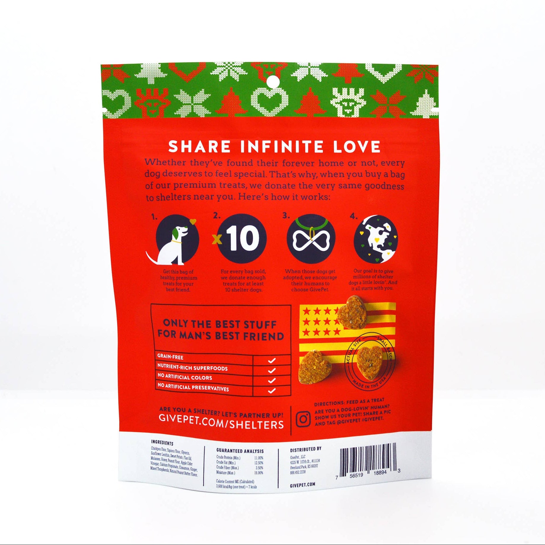 Get ready to paw-ty! These soft, grain-free snacks blend cinnamon, ginger, and peanut butter for a festive flavor dogs can’t resist. Made with wholesome ingredients and plenty of holiday cheer, they’re perfect for pups of all ages — and every bag helps support shelter dogs in need.