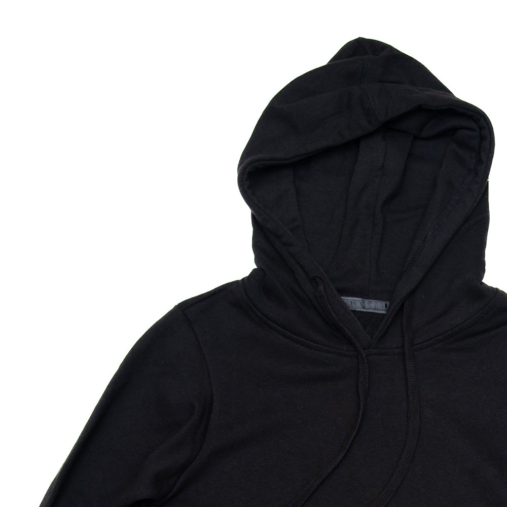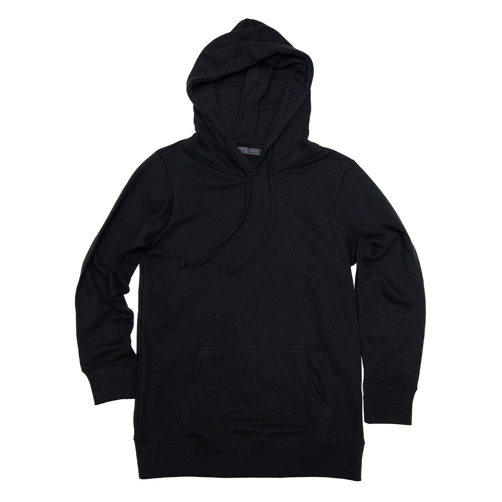 Pullover hoodie is cut from a heavyweight French terry knit and features a longer length, straight contemporary fit, lined drawstring hood, front pocket, raglan sleeves & banded bottom hem. Preshrunk & fits true to size.