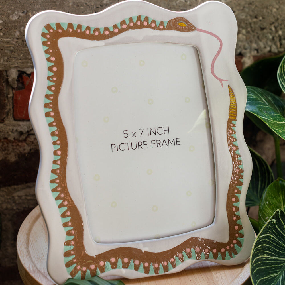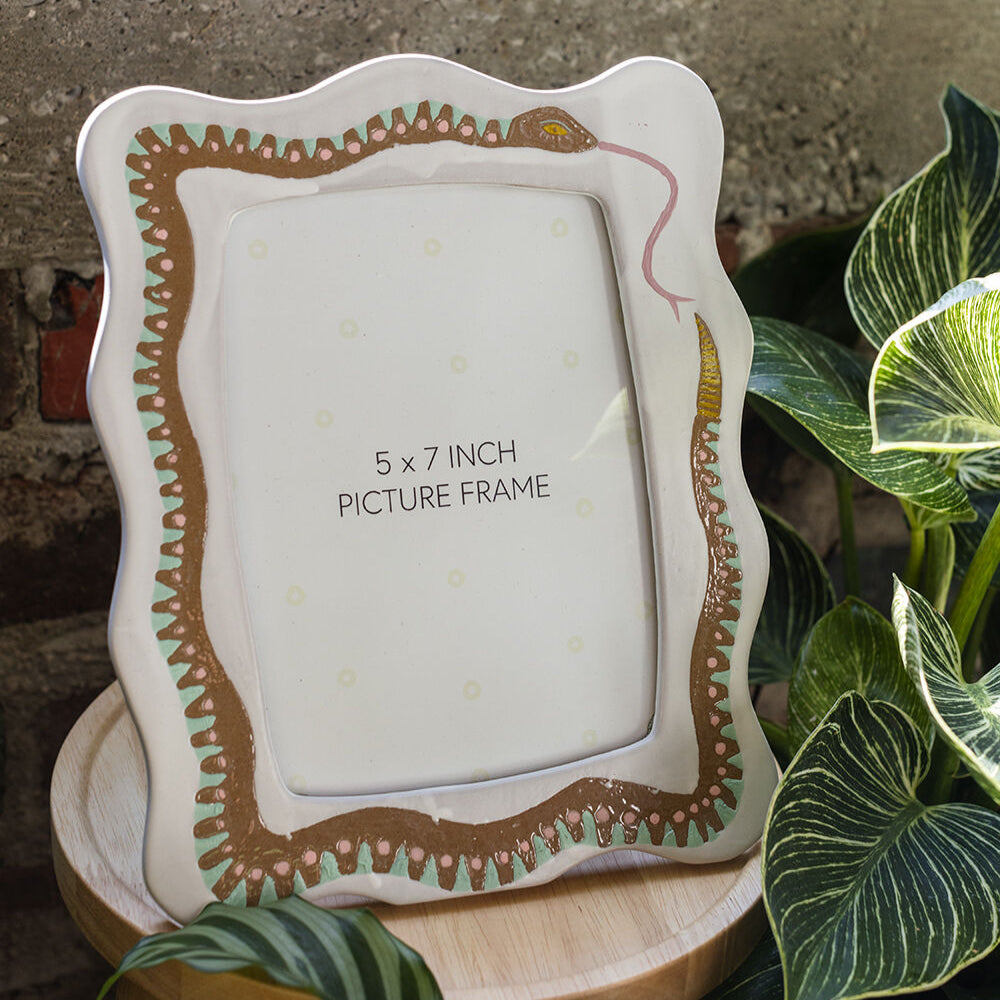 Slither inside your favorite memories. Bold, quirky, and full of personality—featuring a hand painted snake, this frame is perfect for showcasing your top moments with a bit of bite.